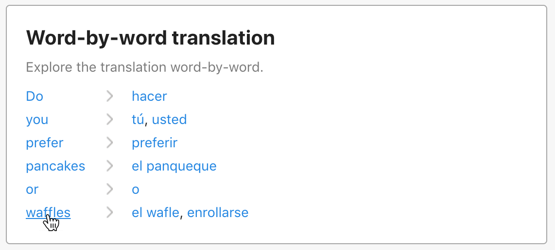 Next, we brought the content team, product manager, graphic designer, and engineers together to brainstorm ways we could better support users puzzling through machine translations of long phrases. We noted that while we didn’t have expert, human translations for long phrases, we did have expert, human translations for all the words that made up the long phrases. The idea for a word-by-word translation feature was born.